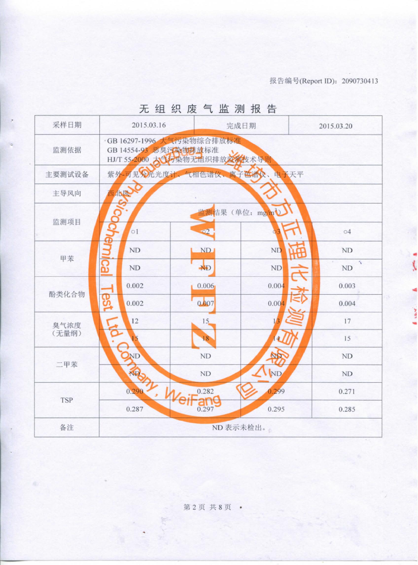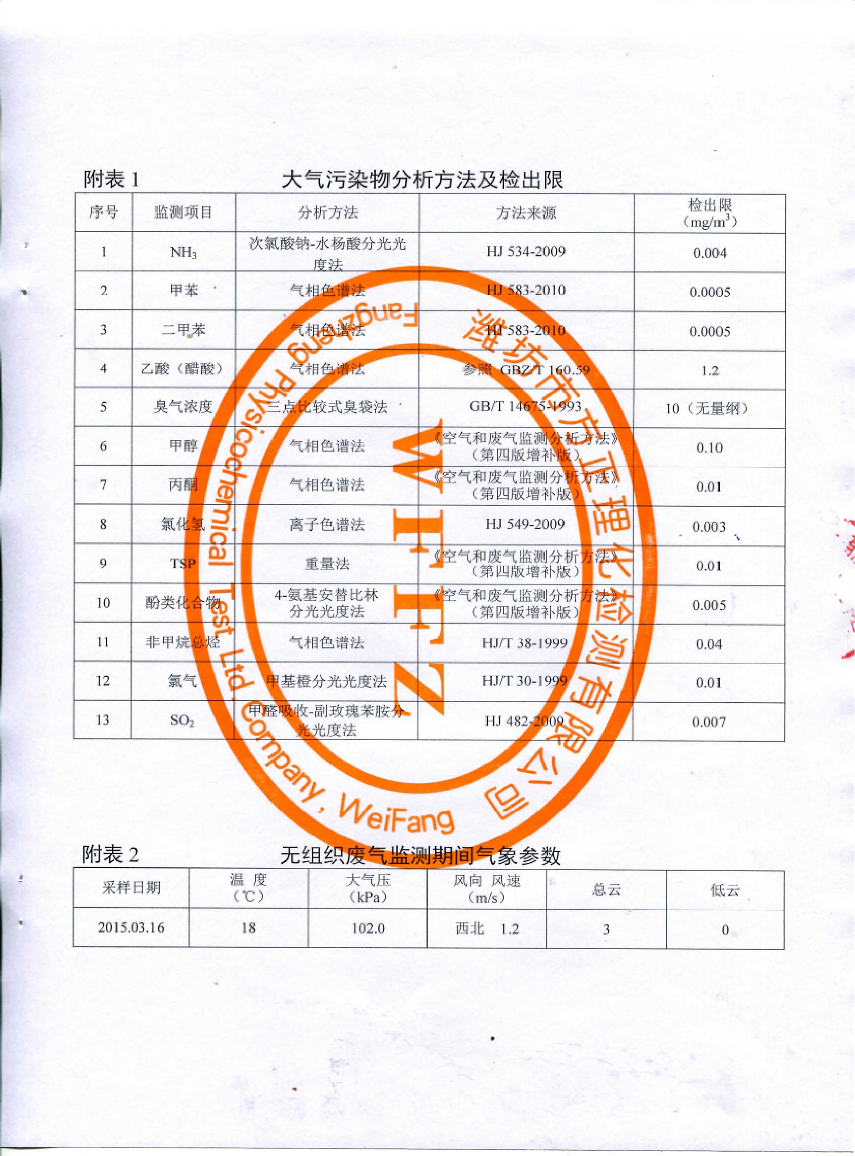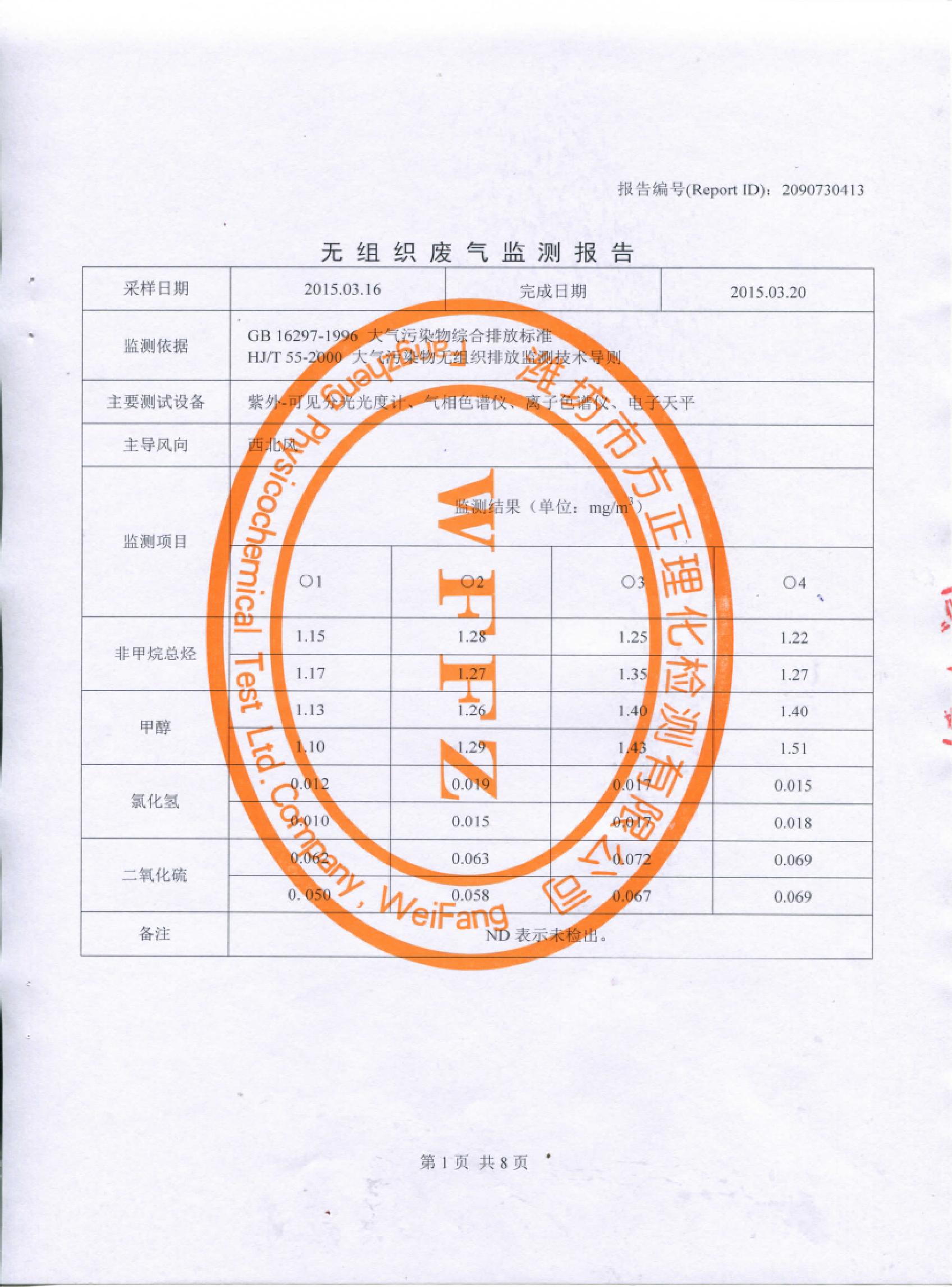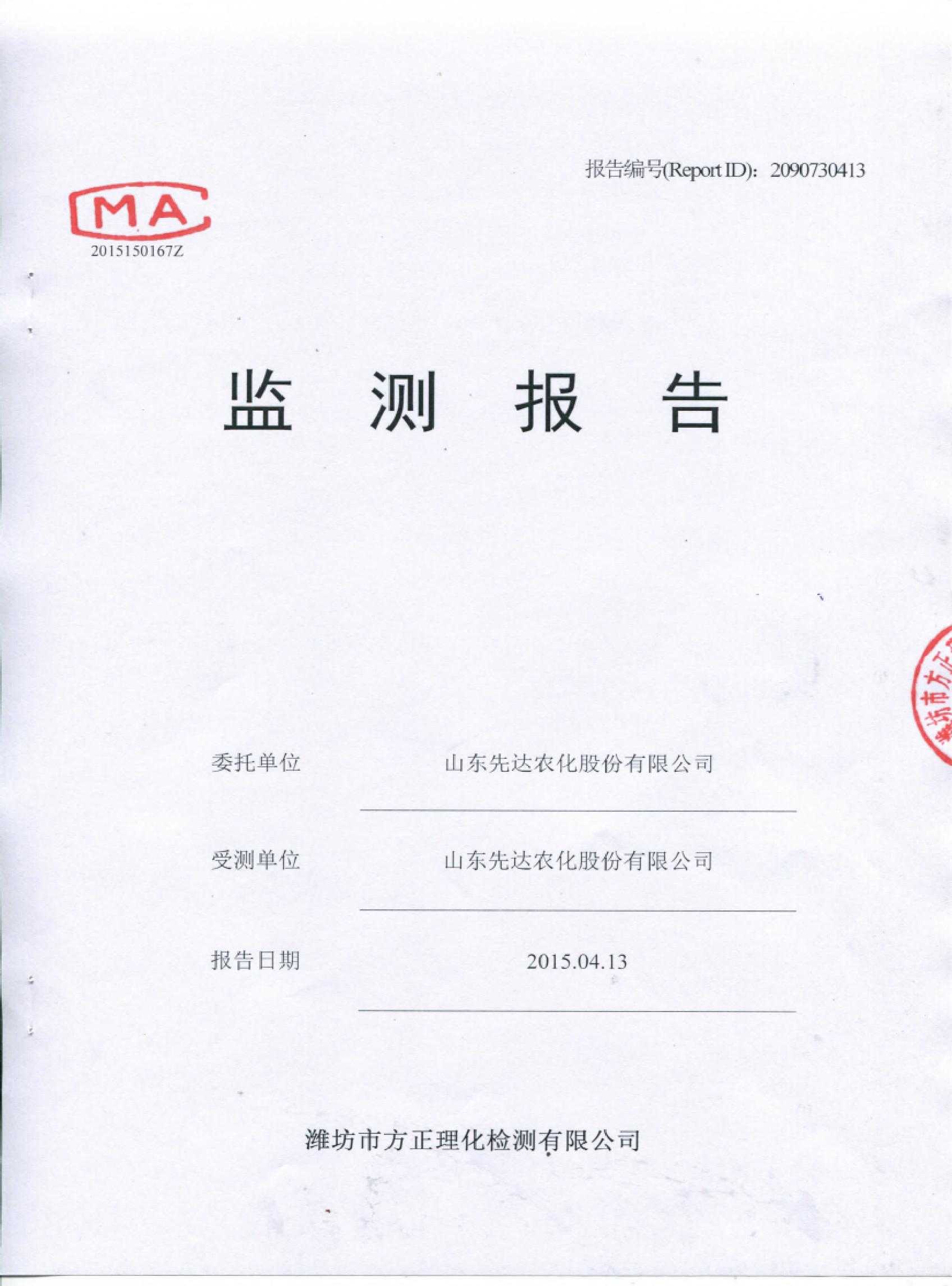 山東先達(dá)農(nóng)化股份有限公司氣體監(jiān)測(cè)報(bào)告2015年第一季度