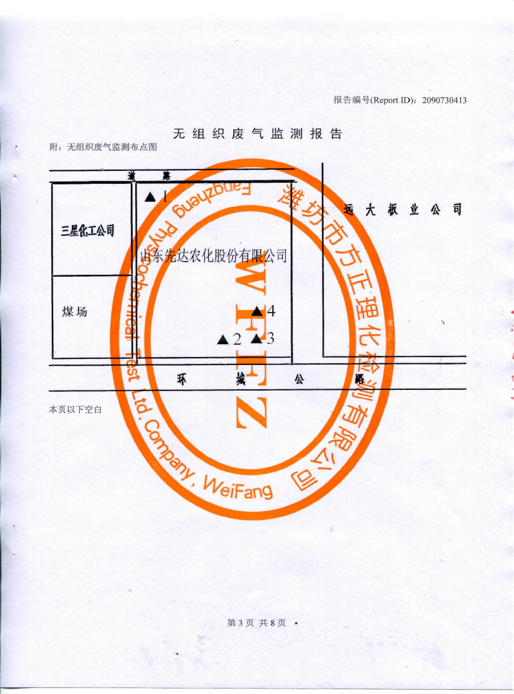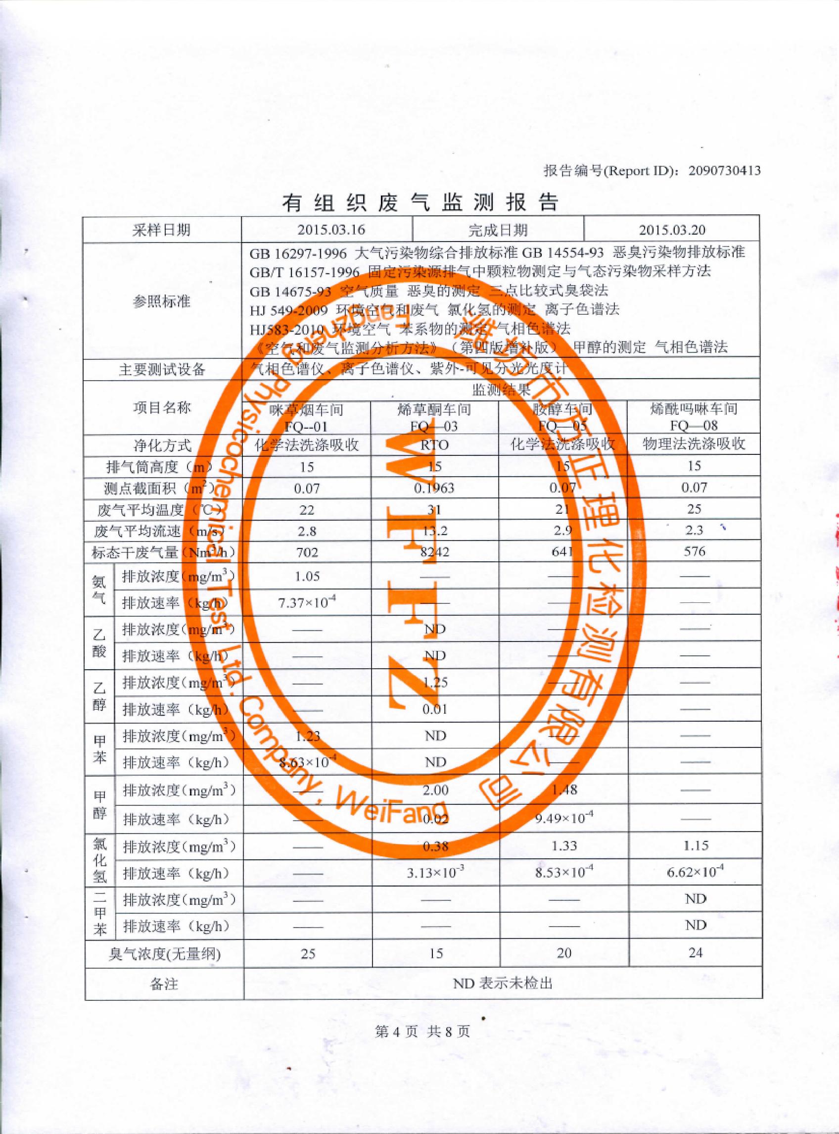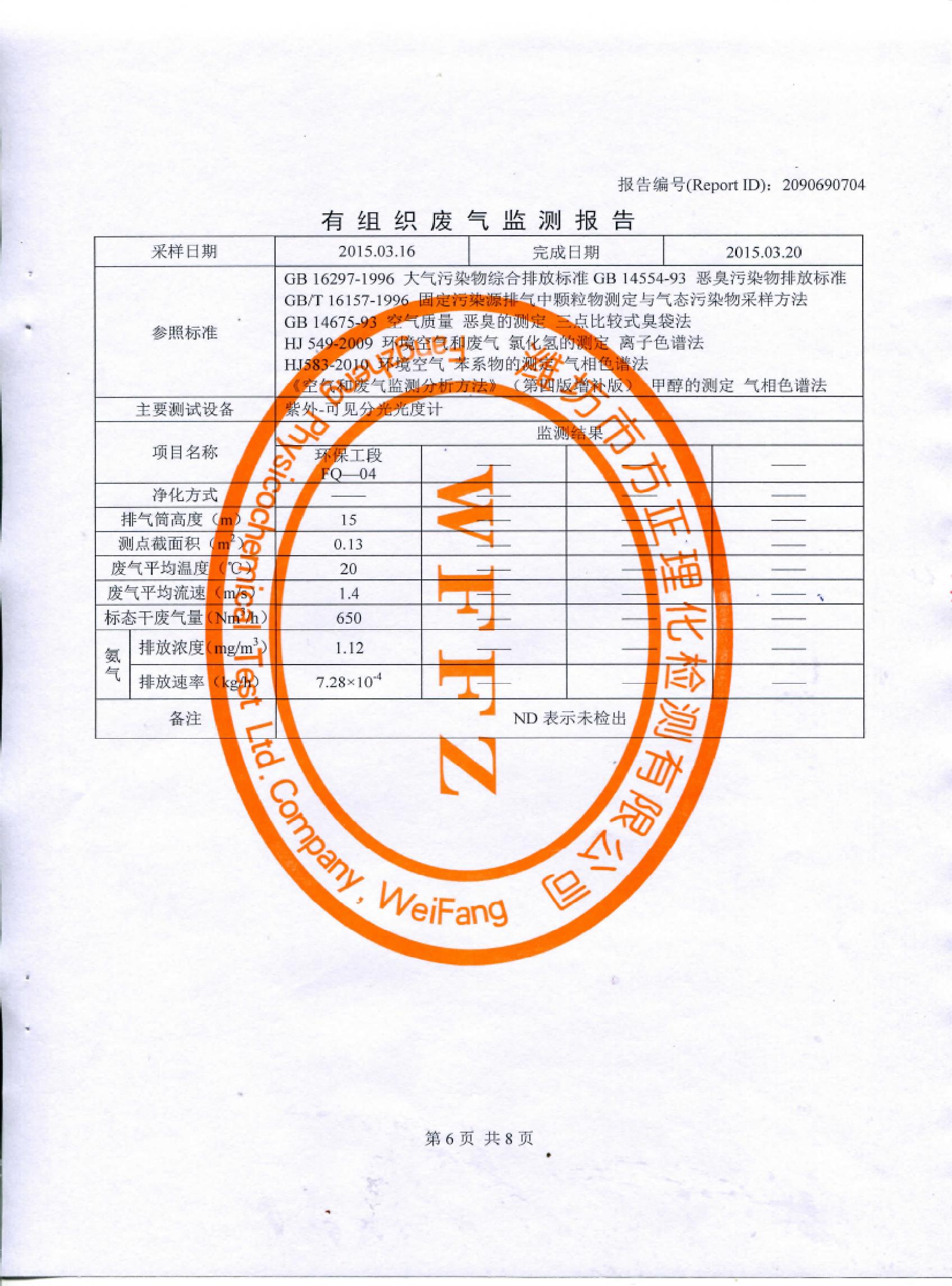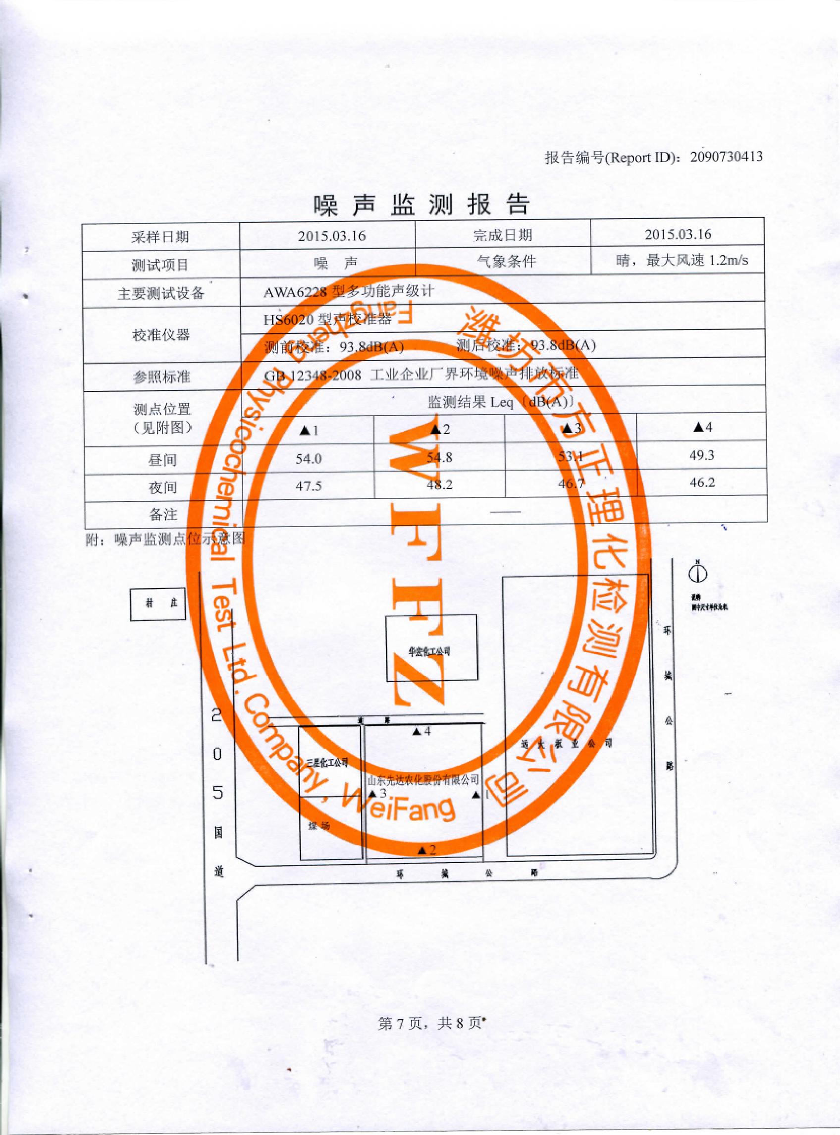 山東先達(dá)農(nóng)化股份有限公司氣體監(jiān)測(cè)報(bào)告2015年第一季度